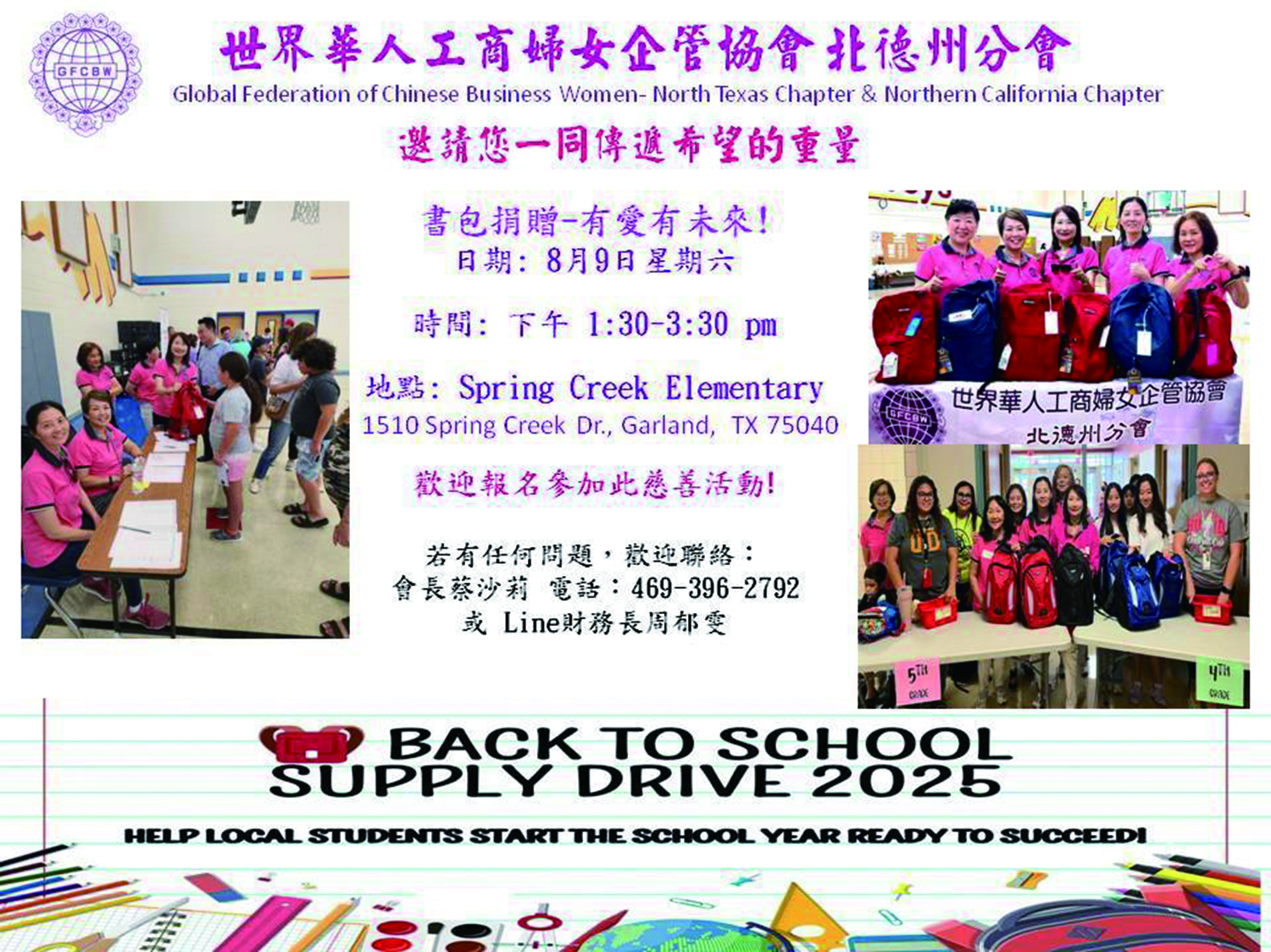 2025年秋季新學期將至,為幫助更多弱勢家庭的學童能順利啟程,世界華人工商婦女企管協會北德州分會(GFCBW North Texas) 將於2025年8月9日(星期六)下午1:30至3:30至Spring Creek Elementary(1510 Spring Creek Dr., Garland, TX 75040)參與一年一度的【書包捐贈活動】。