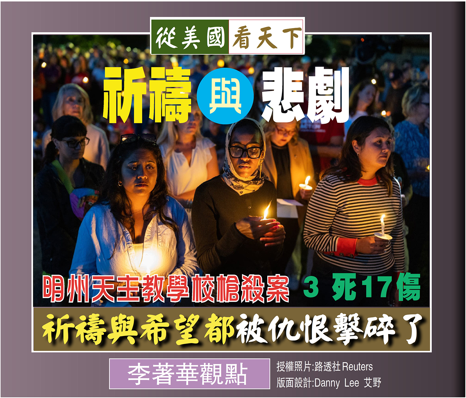 這起槍擊案不僅是一場孤立的悲劇,它更是一面照妖鏡,映照出美國社會長久以來難以癒合的創傷與妖魔鬼,這不禁要問:一椿又一椿的槍案到底要殺害多少無辜的人才能終止? 而此案的殘酷之處在於它發生在一個本應充滿希望與信仰的地方, 當孩子們正在做彌撒、尋求心靈平靜時,竟然被槍聲打破了一切,這是多麼殘忍的事啊! 這是暴徒對良善人性的徹底踐踏和殺害。我們必須嚴肅思考,當仇恨言論透過網路無所不在地散播時,我們如何保護我們的社會,特別是我們的下一代,不被這些有毒的思想侵蝕?