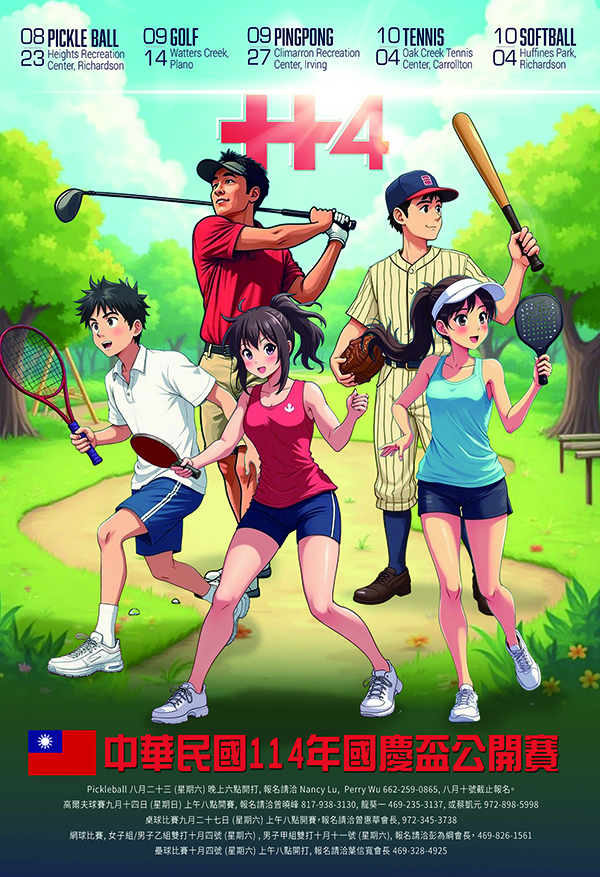 中華民國114年國慶系列慶祝活動已於北德州熱烈展開,內容涵蓋體育競賽、文化展覽、專題論壇與盛大晚宴,展現僑界對中華民國的深厚情感與團結力量。今年系列活動不僅凝聚僑胞情誼,也讓社區朋友在共享佳節氛圍中,體驗文化傳承與交流的熱情。