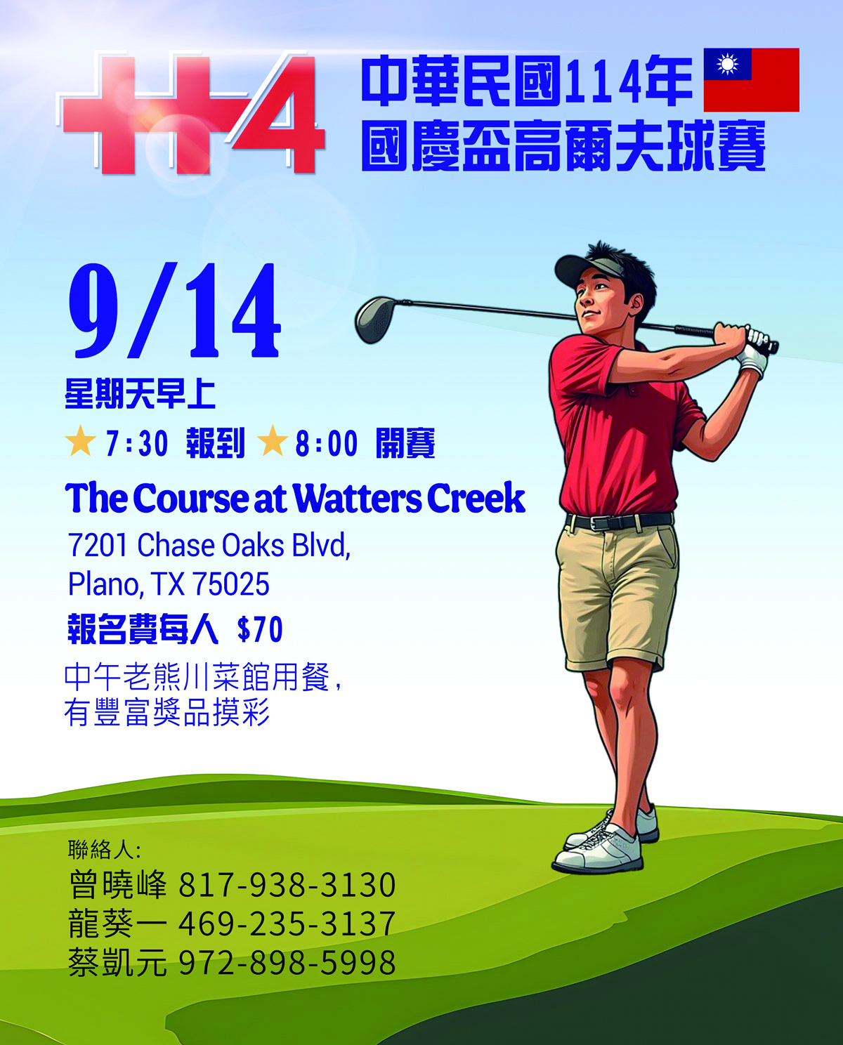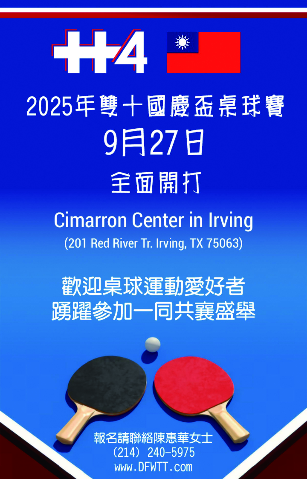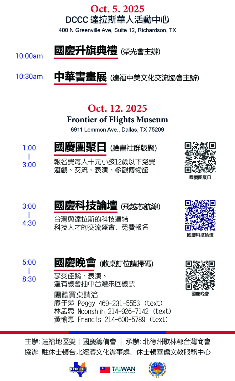 10月5號週日上午 10:00 將於李察遜市達拉斯華人活動中心舉行莊嚴的升旗典禮,由榮光會張志榮會長主辦。期盼國旗冉冉升起的瞬間,能讓海外僑胞對國家有更深情的祝福與認同。