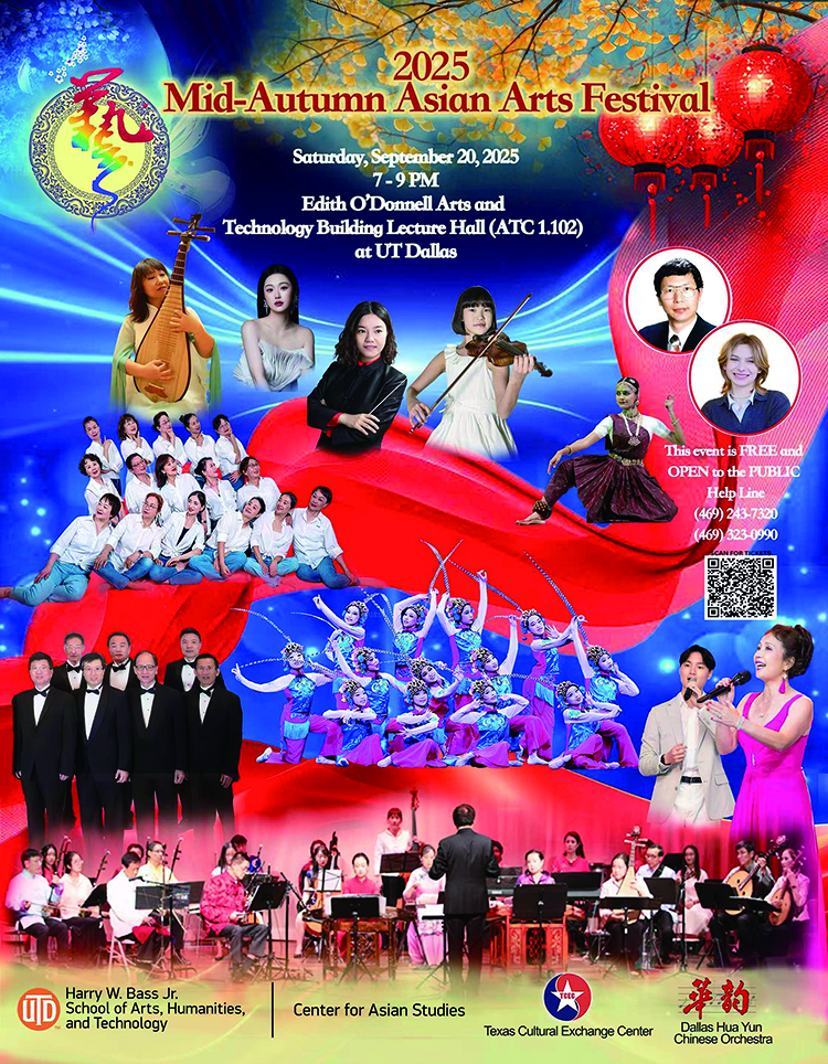 9月20日,(星期六)晚間7:00-9:00pm.由UTD亞洲研究中心,德克薩斯文化交流中心再次联袂主辦-亞裔中秋藝術節綜藝晚會。今年的晚會節目精緻豐富,異彩紛呈,我們誠摯邀請達福地區僑,學,工,商各界好友,攜家帶眷,呼朋引伴,一同來共襄盛舉,歡聚同樂,以最歡快的心情欣賞這場為您精心打造的大型中秋綜藝晚會,一起度過一個難忘的中秋之夜。
