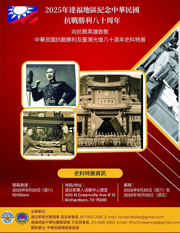誠摯邀請達福地區僑胞共同出席9月20日早上10點的向抗戰英雄致敬史料特展開幕典禮,以及10點30分開始的紀念抗戰勝利的第三場活動:
