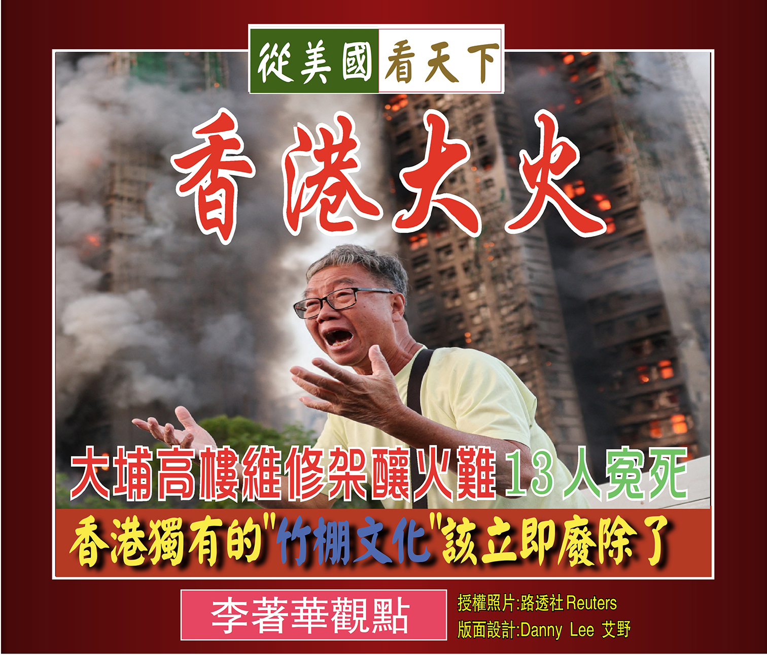 香港新界北部大埔區的宏福苑住宅大樓於今26日發生嚴重火災,造成13人寃死,多人受傷的慘劇。據當地警方與消防部門表示,火勢於下午約3時左右爆發,起火點位於大樓外部搭建的維修用竹棚,火舌隨即順著易燃的建築網與棚架迅速向上蔓延,現場濃煙滾滾,火光沖天,情況一度十分危急。消防當局隨即將火警升級為5級火警(No. 5 alarm),並派出大量消防車與救護車趕赴現場灌救。據現場目擊者指出,當時有多名住戶受困於高樓層單位內,部分居民站在窗邊揮舞毛巾求救,險象環生,一到位丈夫因為妻子陷身火海而哀號的畫面被透路社拍攝到,真是悽慘萬分!