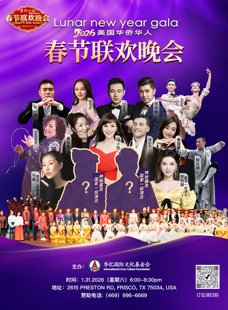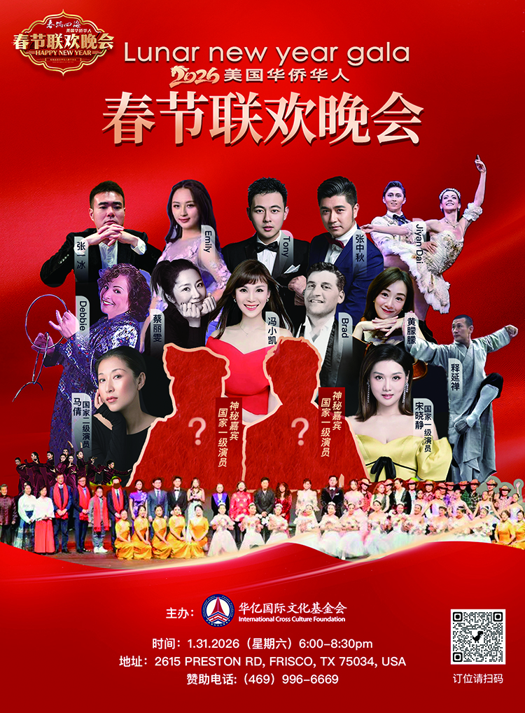 由美國華億國際文化基金會主辦的「春滿四海-2026美國華僑華人春節聯歡晚會」將於2026年1月31日6:00-8:30pm在美國德克薩斯州弗里斯科(Hyatt Regency Frisco)拉開序幕,這也將是該團為遠離第六年的《華人》連續第六年舉辦《華春土》。