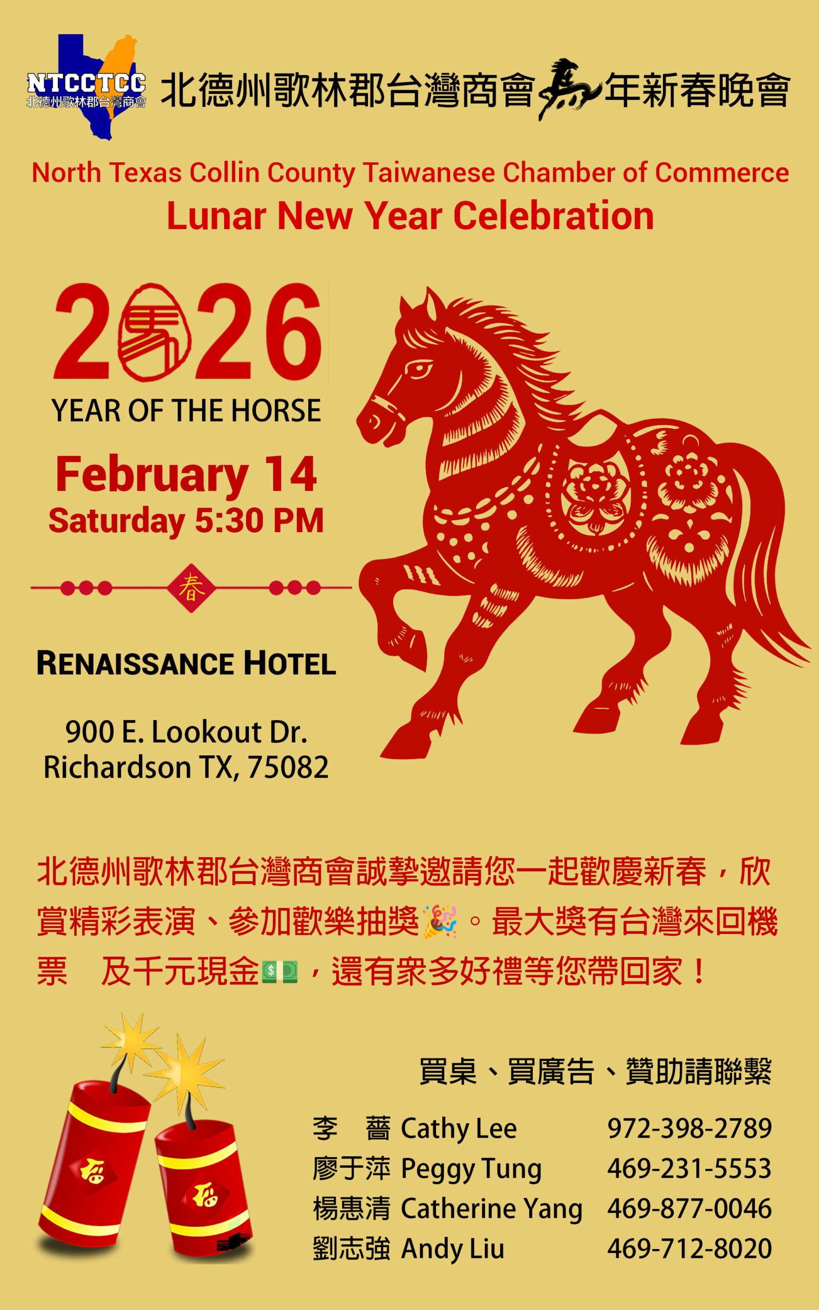 北德州歌林郡臺灣商會誠邀達福地區僑胞朋友一起共襄盛舉,提前來迎接紅紅火火能量旺旺的「赤馬年」所帶來的好兆頭。新朋舊友相聚一堂,圍桌敘舊,分享佳餚,同慶同樂,共度一個溫馨歡樂的三合一新春晚會,並為自己留下一個美好回憶。