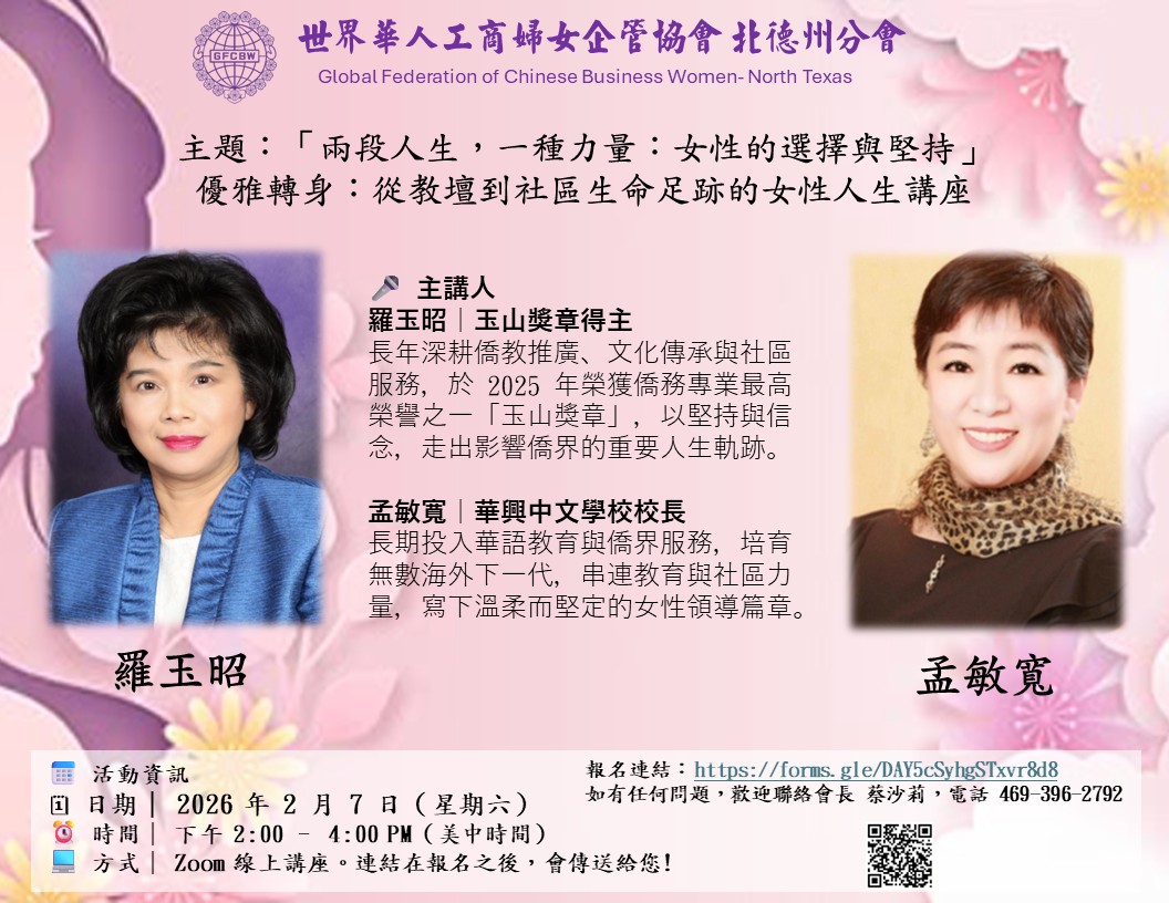 世界華人工商婦女企管協會北德州分會將於 2026 年 2 月 7 日(星期六)下午 2:00–4:00(美國中部時間),舉辦一場以女性生命歷程為主軸的 Zoom 線上講座。人生在不同階段,往往站在選擇的關鍵路口——是堅守初心,還是勇敢轉身?本次講座將透過真實而深刻的生命故事,引領大眾看見「選擇」與「堅持」所累積而成的深層力量。