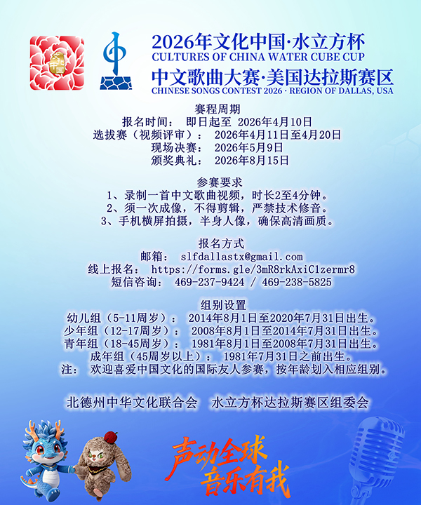 達拉斯賽區組委會正式宣布: 報名通道現已開啓!歡迎廣大選手即日起通過官方鏈接 https://forms.gle/3mR8rkAxiC1zermr8 提交演唱作品。讓我們共同期待在5月的决賽現場,與各位歌唱才俊共聚線下,共話音樂夢想。