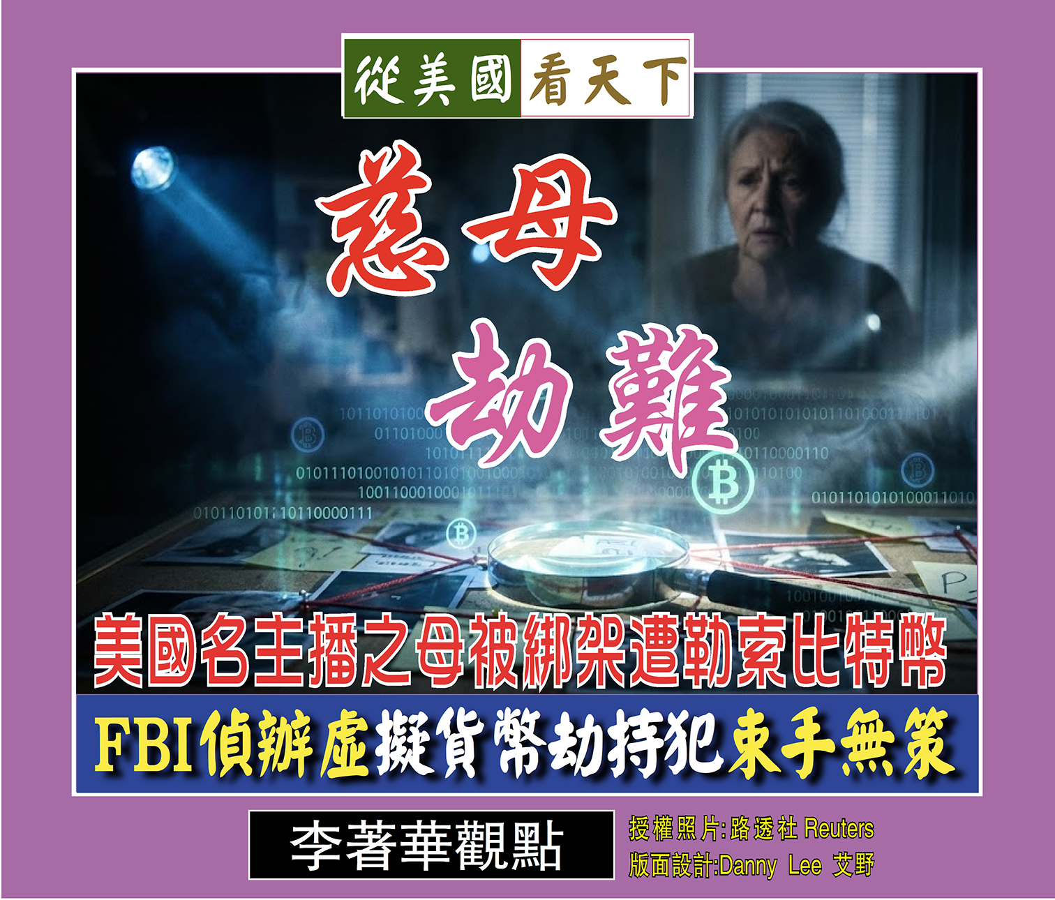震驚全美的電視「今日秀」(Today)知名女主持人薩凡納·格思里(Savannah Guthrie)之母–84歲的南希·格思里失蹤已逾一週,案情陷入膠著, 綁匪發出第二道贖金期限已到期,勒索金高達600萬美元,且要求以比特幣付款, 尚不清楚家屬是否願交付贖金。莎凡娜在媒體上發布沉痛請求,坦言家族處於絕望時刻,但堅信母親仍存活。聯邦調查局FBI尚未鎖定嫌疑人,這起針對高齡名人家屬的綁架案,正考驗著執法單位的破案能力與社會治安的底線。