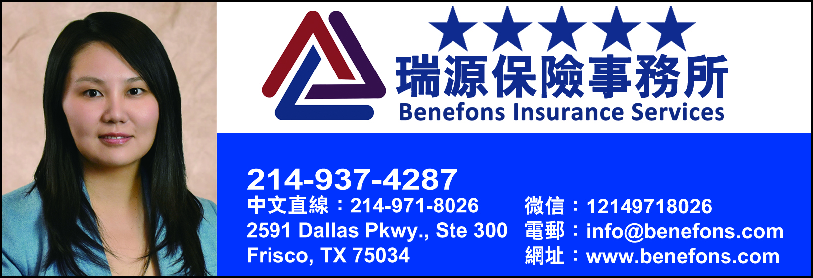 張瑞女士直線電話:214-971-8026,微信個人號:12149718026,公司Email: INFO@BENEFONS.COM。公司在達拉斯和休斯頓均有辦公室,服務全德州居民。