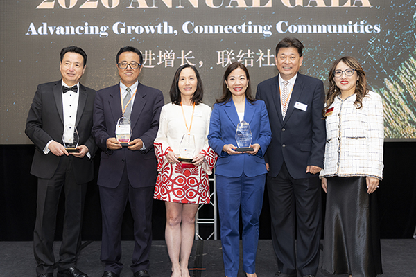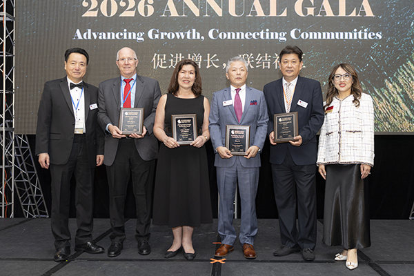 晚宴現場舉行了隆重的頒獎儀式,致敬常年無私為社區付出的人。Steve Chen 榮獲社區領袖獎,Bing Xie 獲頒杰出慈善貢獻獎,Jane Li 獲評商會杰出會員獎。此外,商會向亞裔商會 (Asian Chamber of Commerce) 頒發了杰出戰略合作夥伴獎。