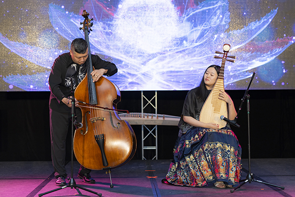 晚宴期間,富有中國韵味的藝術表演為嘉賓帶來了一場視聽盛宴。商會執行團隊成員陳雨澄以古箏獨奏《滄海一聲笑》詮釋了豪情萬丈的武俠精神;青年琵琶演奏家田程錦則通過琵琶獨奏《琵琶魂》與《茉莉花》,展現了民樂的細膩之美。隨後,田程錦與低音提琴演奏家王鵬合奏一曲《雨碎江南》,琵琶的清脆與低音大提琴的厚重完美交織,實現了東西方樂器的華彩碰撞。
