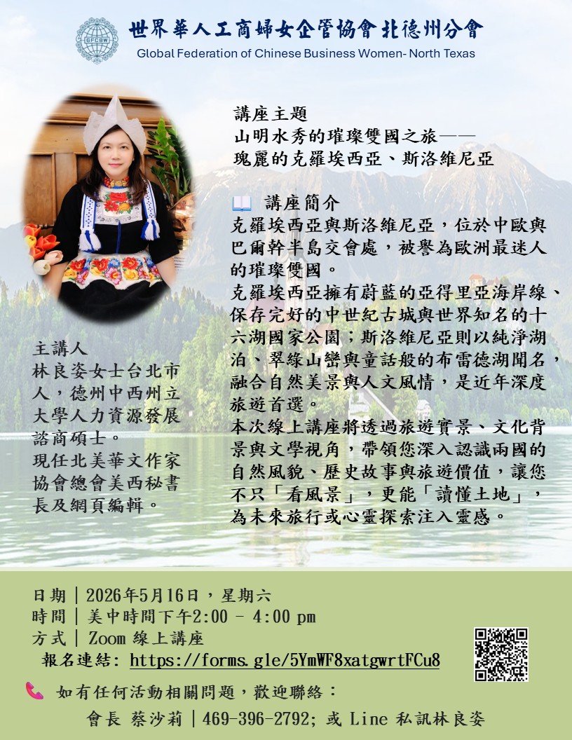 世界華人工商婦女企管協會北德州分會將於五月六日(星期六)舉辦一場兼具人文深度與旅遊美學的 Zoom 線上講座,主題為 「山明水秀的璀璨雙國之旅——瑰麗的克羅埃西亞、斯洛維尼亞」。本次講座將帶領與會者走進中歐與巴爾幹半島交會處的兩顆明珠,透過文化、歷史與實地旅遊視角,感受歐洲自然與人文交織的獨特魅力。