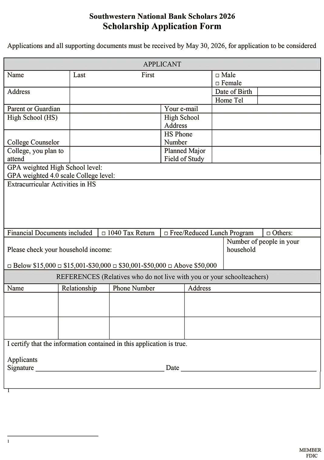 申請資格不限於美南銀行客戶;詳細規定及申請表下載請參閱美南銀行網站www.swnbk.com,或至各分行索取表格。洽詢聯絡人:Ling Chuang (莊幃婷),電話713-272-5045,email: ling.chuang@swnbk.com。